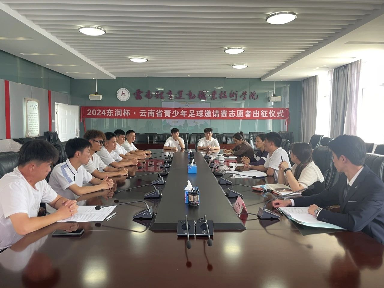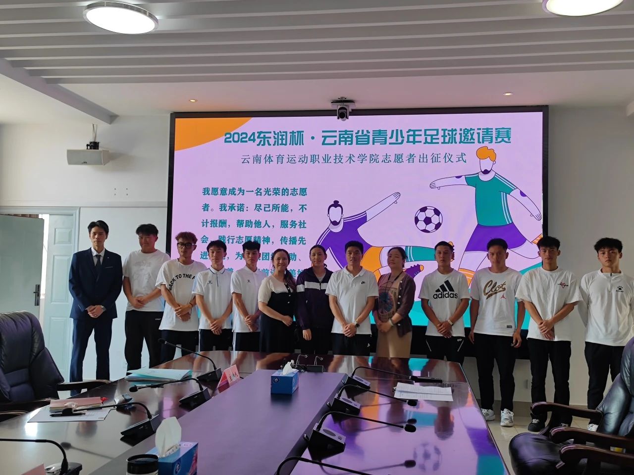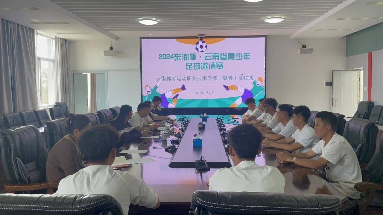 2024年5月23日在我校云帆楼第一会议室举行了“2024东润杯·云南省青少年足球邀请赛支教志愿者出征仪式”。我校团委书记陈明照、云南省青少年发展基金会希望小学建设部主管肖宇娟、我校足球支教培训教师和校团委老师们出席了此次活动。为即将前往丽江、宣威、开远、禄丰市8所中小学进行60天的支教志愿服务的8位志愿者同学做出征前的动员、培训以及送行。